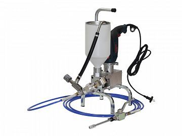 Компактный и легкий поршневой насос с приводом от электродрели для инъекционных работ с применением однокомпонентных и готовых двухкомпонентных полиуретановых, эпоксидных и других полимерных составов. Насос оснащен перепускным регулятором давления. Насос смонтирован на компактной металлической подставке, что позволяет использовать его в стесненных условиях.